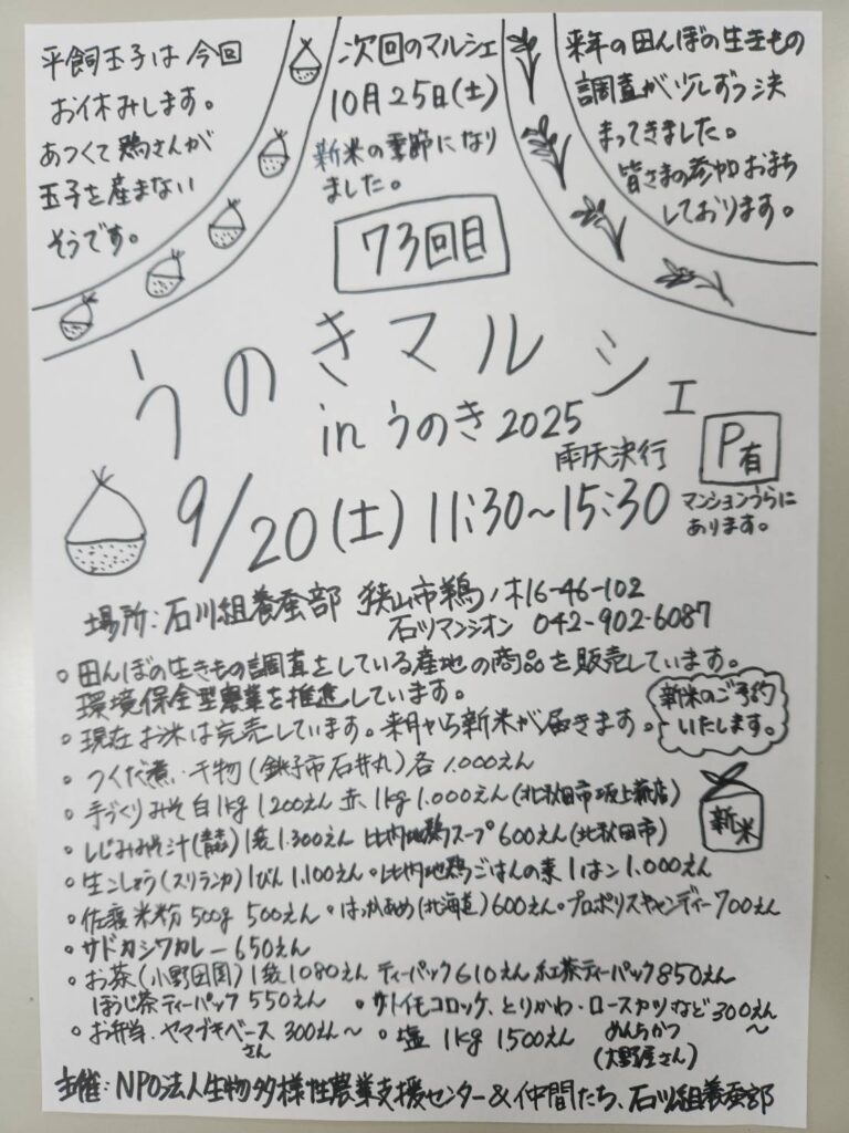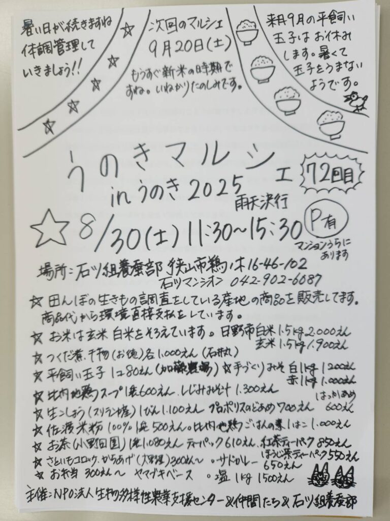 去る7月26日、8月30日、9月20日、狭山市鵜ノ木の石川組養蚕部にて「うのきマルシェ」を開催いたしました。炊き出しをメインに田んぼの生きもの調査に参加している農家さんのお米のほか、菌ちゃん農法で作った野菜、私たちの活動に賛同していただいている生産者さんの農海産物、飲食店さんのお惣菜、お弁当を販売いたしました。盛況のうちに無事に終えることができました。次回は10月25日(土)の開催となります。奮ってご参加ください。