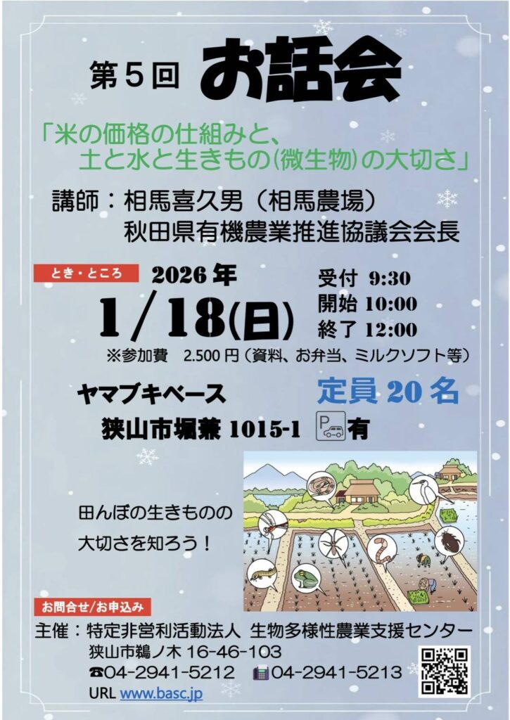 NPO法人生物多様性農業支援センターでは1月18日(日)に相馬喜久男氏を講師に迎え、第5回お話会を開催いたします。「米の価格の仕組みと、土と水と生きもの(微生物)の大切さ」をテーマにお話を伺います。現役の農家さんから田んぼの生き物の大切さを聞くまたとない機会です。場所はヤマブキベース様となります。特製のお弁当と佐渡産ミルクのソフトクリームもございます。下記申込書PDFをダウンロードの上、お申し込みください。ぜひ、ご参加ください。